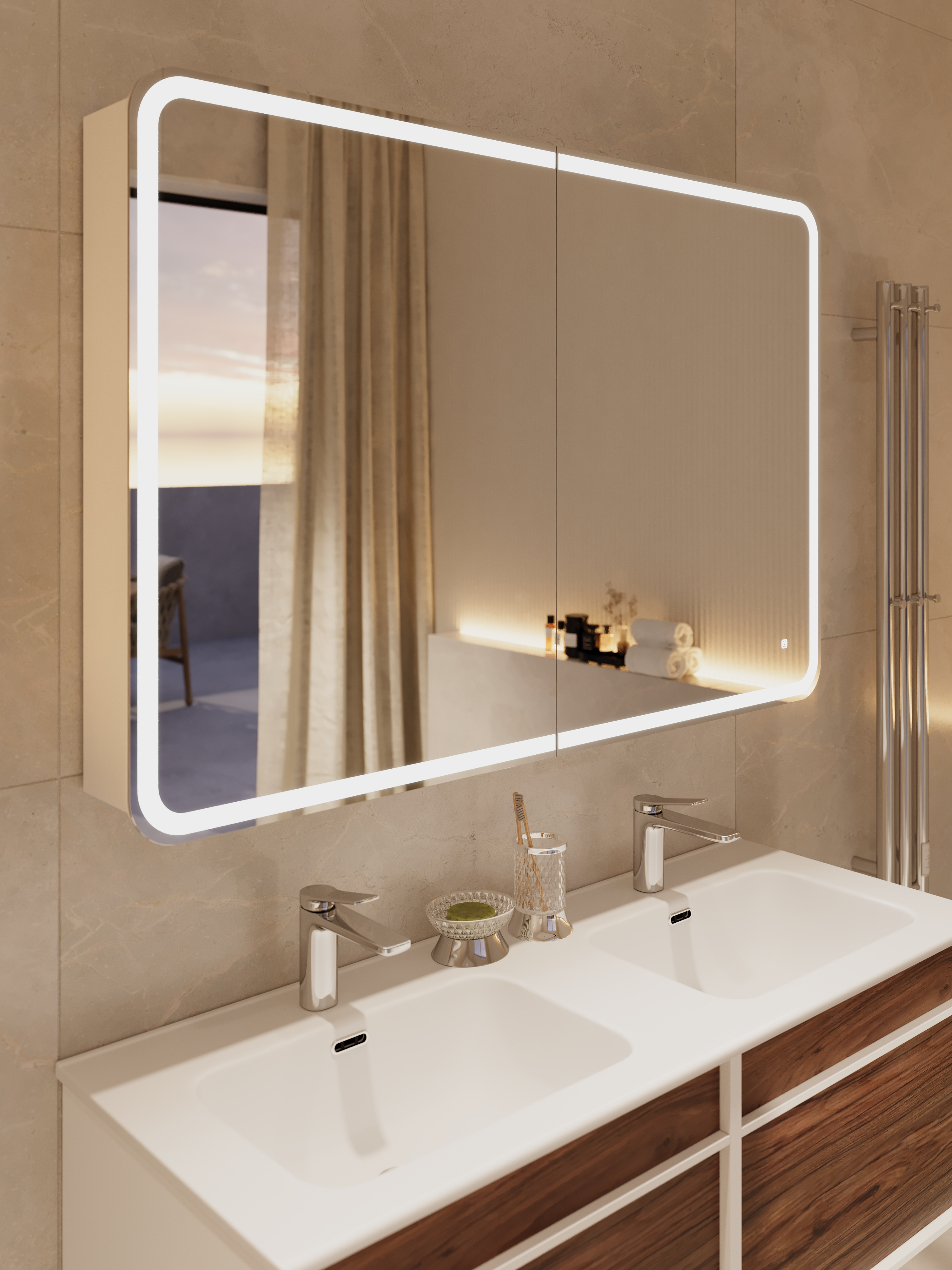 Преимущества: зеркальное полотно AGC,еврокромка,120 светодиодов на метр,датчик движения на взмах руки,регулировка