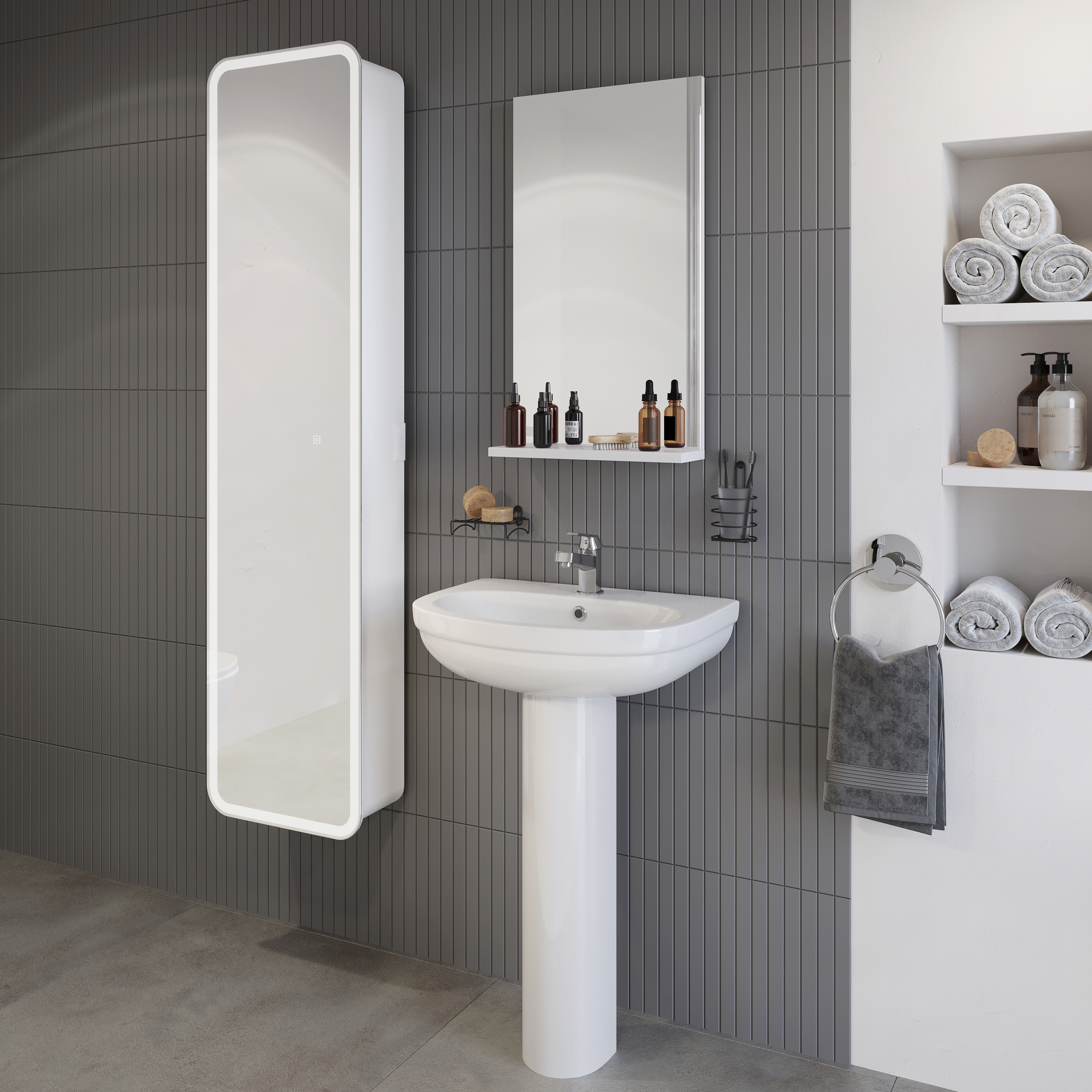 Комплект Раковина DIWO Коломна 0110 + Сифон Wirquin Минор с отводом для стиральной машины + Пьедестал полукруг 0200 + Зеркало Псков 40 с полкой, белое, узкое, прямоугольное, в современном стиле