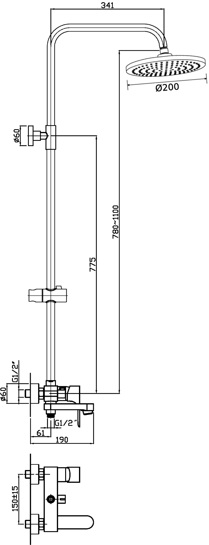 Включает: ручная лейка,верхний душ