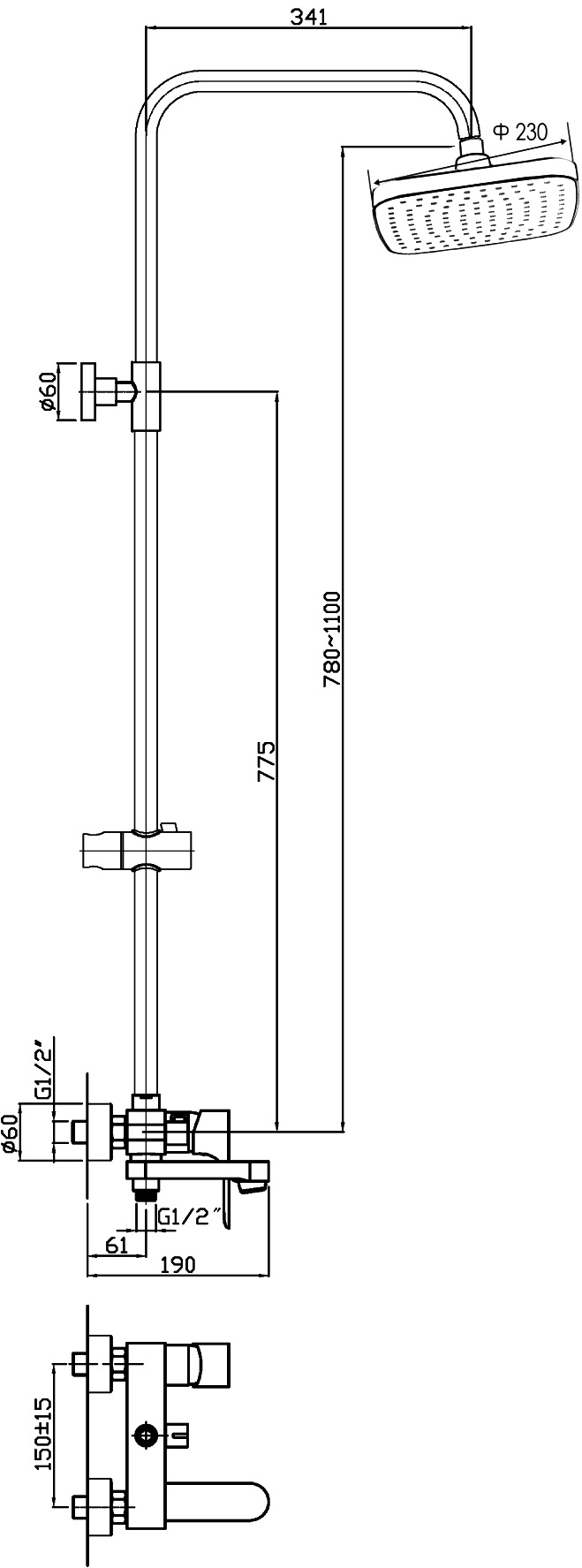 Включает: ручная лейка,верхний душ