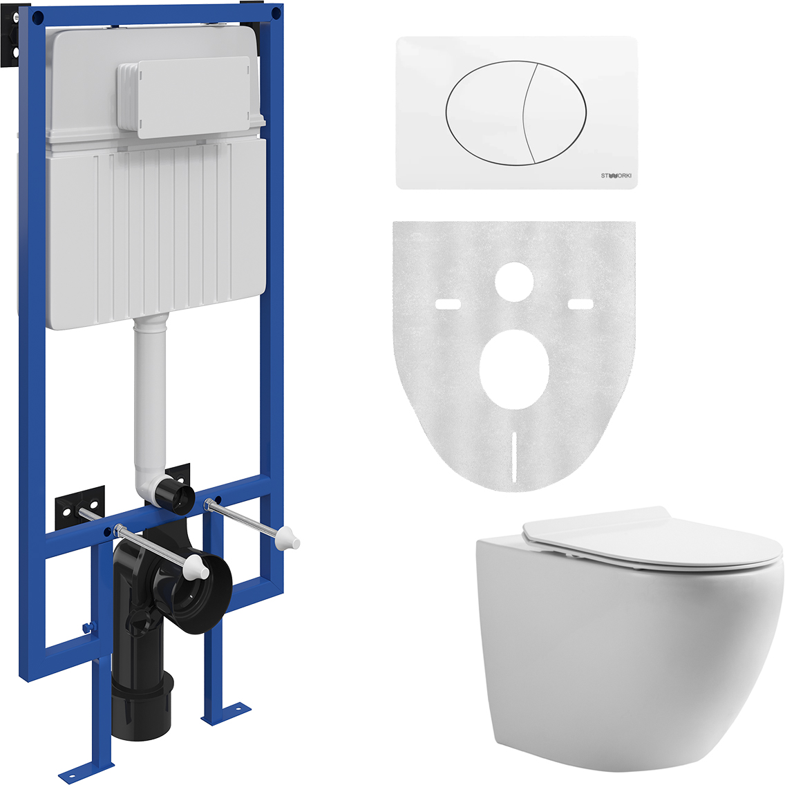 Комплект 3 в 1 Унитаз подвесной STWORKI Кронборг KR-01up безободковый, с микролифтом, встроенный, фарфор, с горизонтальным выпуском + Инсталляция 510162 + Кнопка 230824 цвет матовый белый