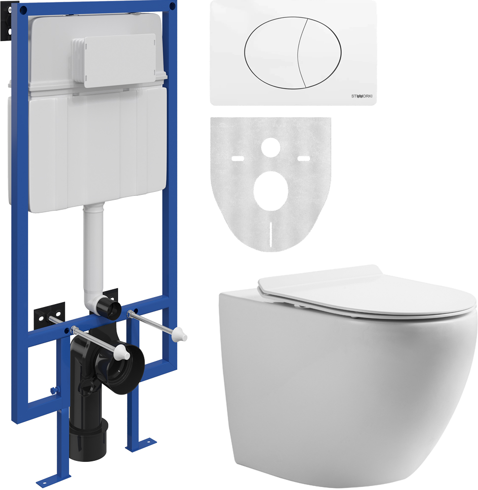 Комплект Унитаз подвесной STWORKI Кронборг KR-01up безободковый, с микролифтом, встроенный, фарфор, с горизонтальным выпуском + Инсталляция + Кнопка 230824 белая