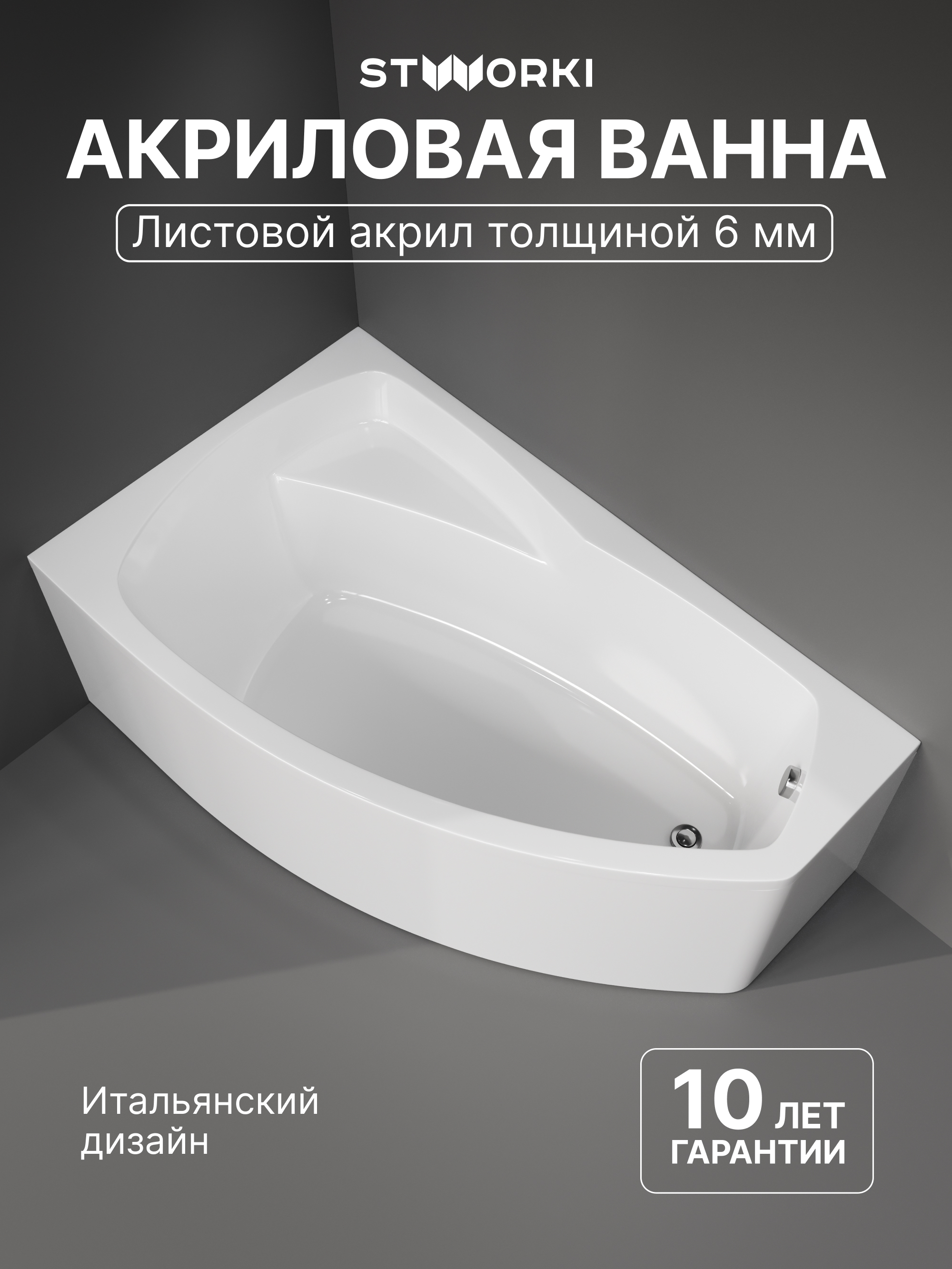 Акриловая ванна STWORKI Монтре L 160x95 см, угловая, левая, пристенная, белая, асимметричная, с каркасом, с сиденьем