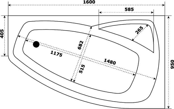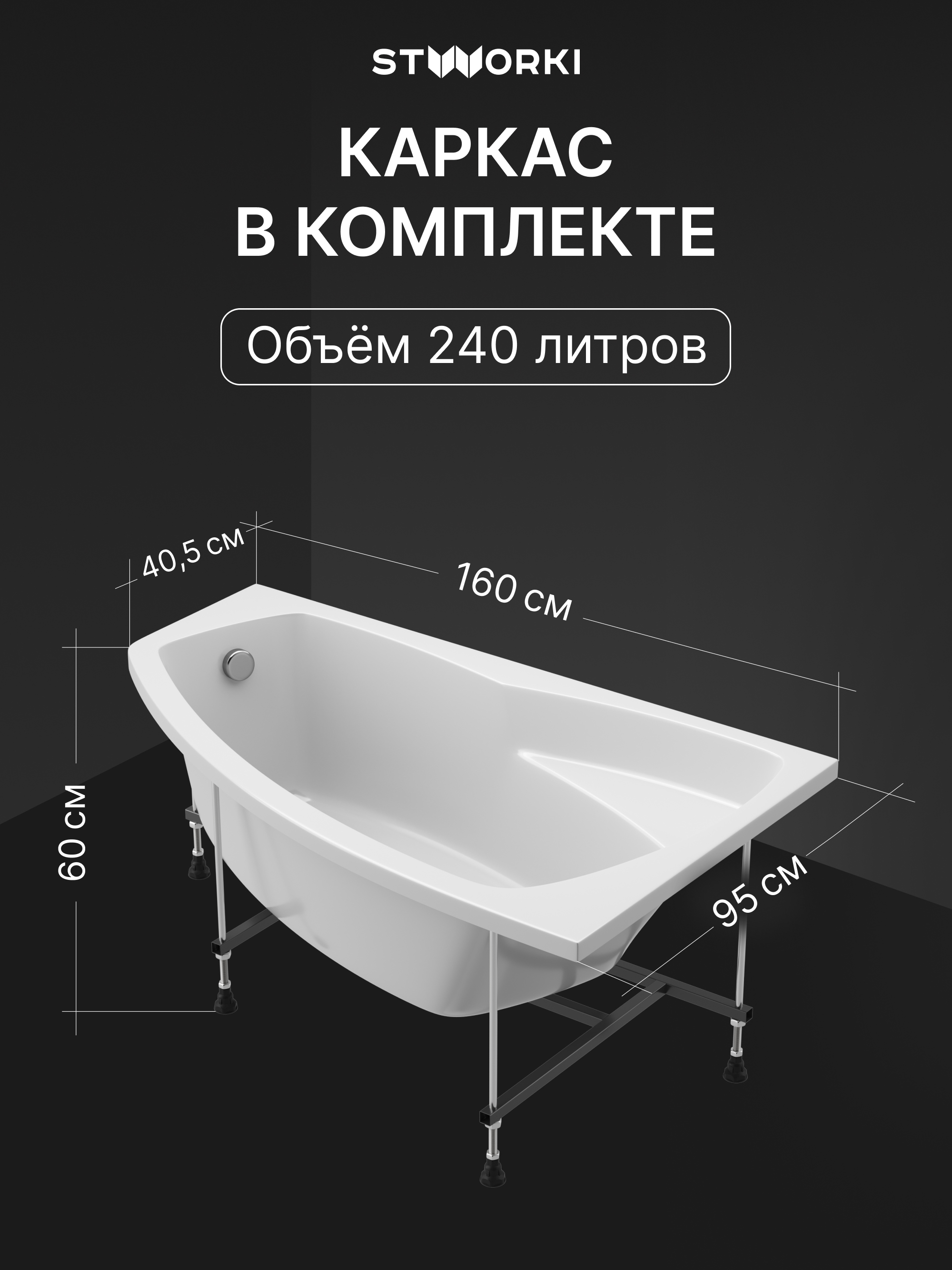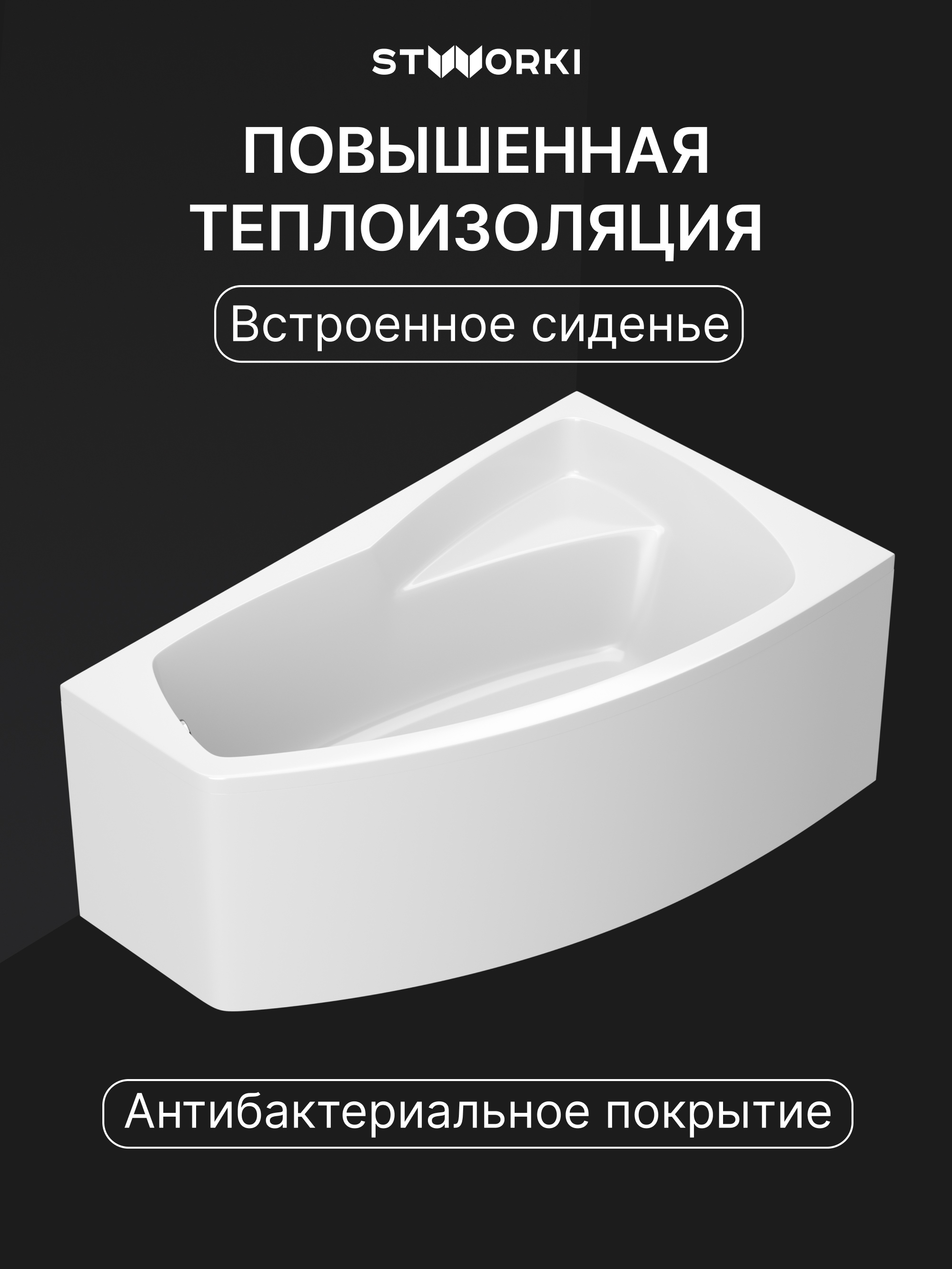 Акриловая ванна STWORKI Монтре R 160x95 см, угловая, правая, пристенная, белая, асимметричная, с каркасом, с сиденьем
