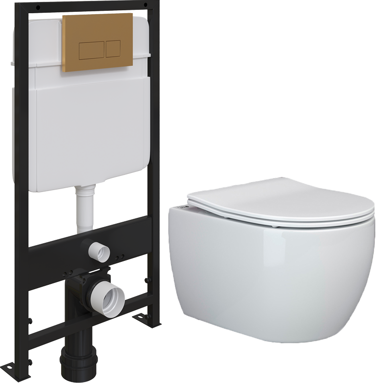 Комплект Унитаз подвесной Ceramica Nova Play CN3001 безободковый, с микролифтом + Система инсталляции для унитазов EWRIKA ProLT 0026-2020 + Кнопка смыва EWRIKA 0043 золото матовое