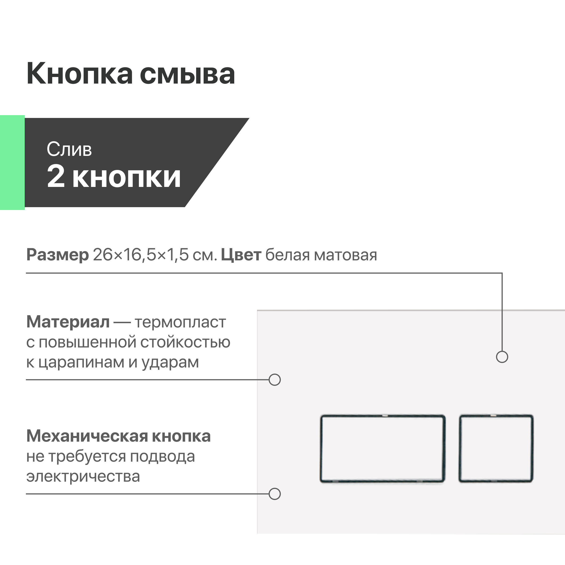 Режим слива воды: определяется механизмом системы инсталляции/скрытого бачка,2 кнопки (эконом)