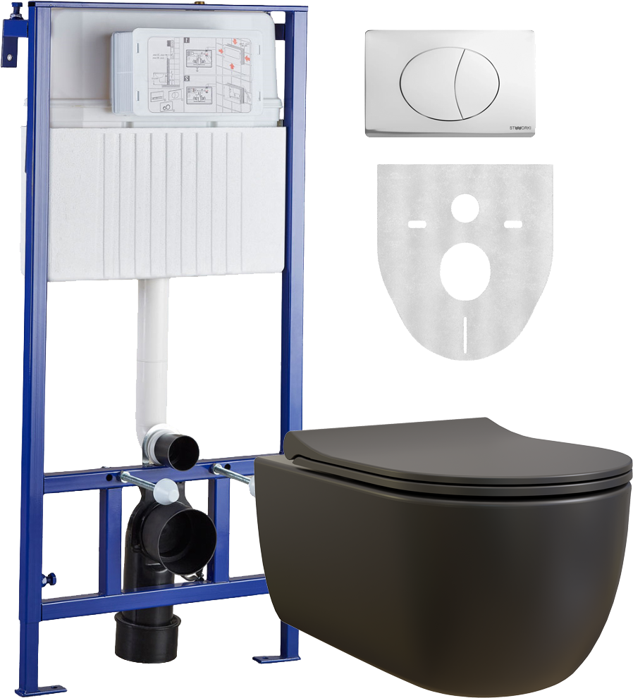 Комплект Унитаз подвесной BOCCHI V-Tondo 1416-004-0129 тонкая крышка с микролифтом, черный матовый + Система инсталляции для унитазов STWORKI 510163 + Кнопка смыва STWORKI 230823 хром матовый