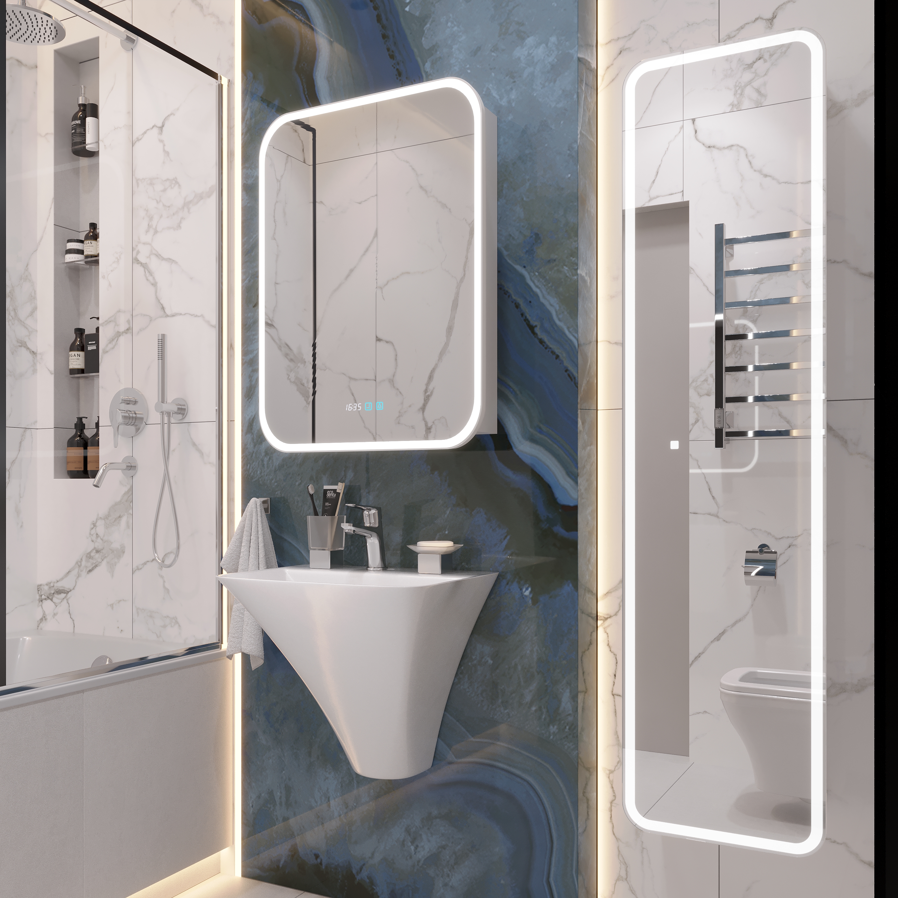 Оснащение зеркала: часы,регулируемая подсветка,подвесы