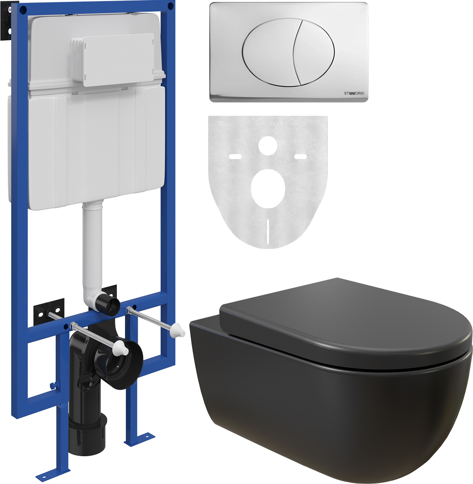 Комплект Унитаз подвесной BOCCHI V-Tondo 1416-004-0129 с микролифтом, черный матовый + Система инсталляции для унитазов STWORKI 510163 + Кнопка смыва STWORKI 230823 хром матовый