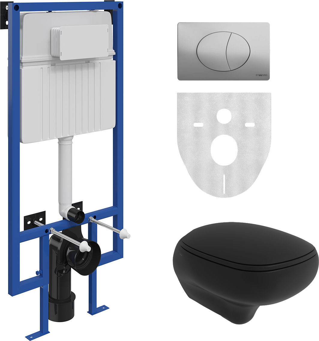 Комплект Унитаз подвесной BOCCHI Fenice 1166-004-0129 черный матовый, с микролифтом + Система инсталляции для унитазов STWORKI 510162 + Кнопка смыва STWORKI 230823 хром матовый