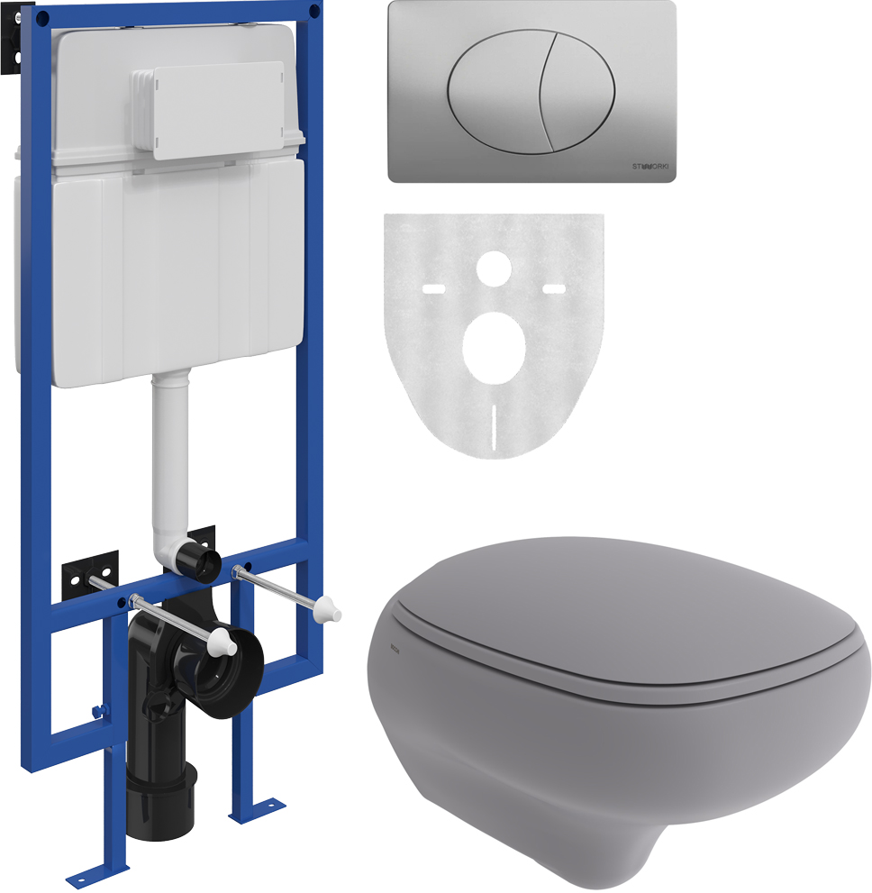 Комплект Унитаз подвесной BOCCHI Fenice 1166-006-0129 с микролифтом, серый матовый + Система инсталляции для унитазов STWORKI 510163 + Кнопка смыва STWORKI 230823 хром матовый