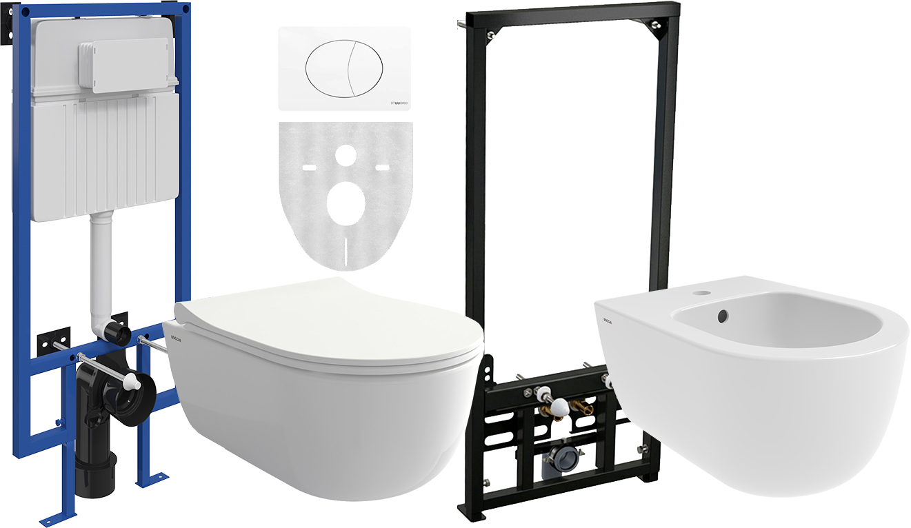 Комплект Унитаз подвесной BOCCHI V-Tondo Rimless 1417-001-0129 белый глянцевый + Крышка A0336-001 с микролифтом, глянцевая белая + Инсталляция STWORKI 510162 + Кнопка 230824 белая + Биде 1487-001-0120 + Инсталляция AlcaPlast A105 /1120